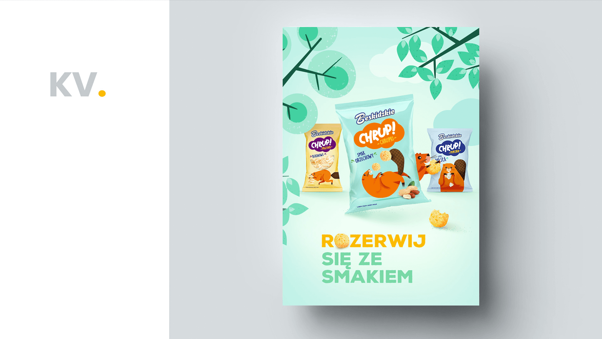 Packaging Design for Beskidzkie Snacks designed a set of packaging for Beskidzkie snacks, inspired by a provided illustration of a playful beaver. Each package prominently displays the flavor through both text and visual elements, accompanied by the charming beaver character interacting with the snacks. The design aims to be vibrant and appealing, emphasizing the fun and enjoyable experience of the crisps. The consistent color scheme and layout across the range help maintain brand cohesion while allowing each flavor to stand out.